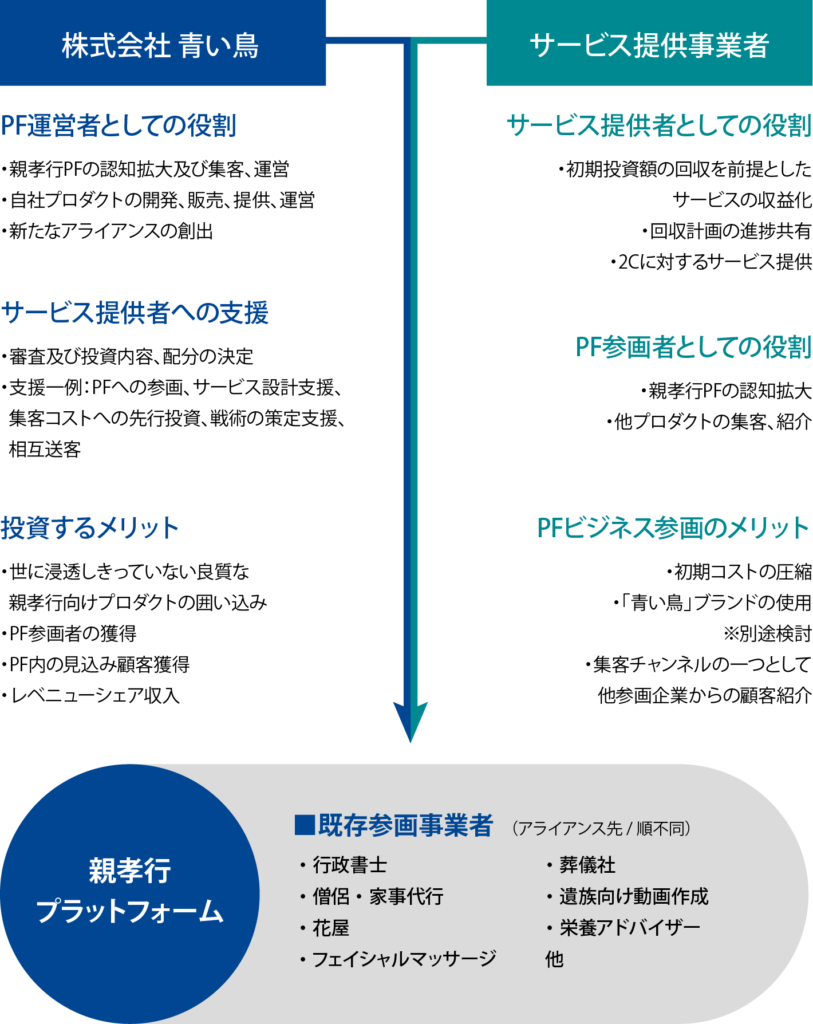 親孝⾏に関わる新規事業の⽴ち上げ 親孝行に関連する新規ビジネスの立ち上げ検討者に対し、一定額の資金を含むリソース支援(=初期投資)を実施。相互に顧客紹介を実施するなど、双方にメリットが見込めるアライアンスを提供。