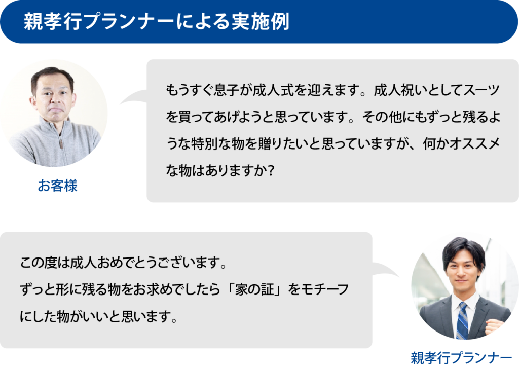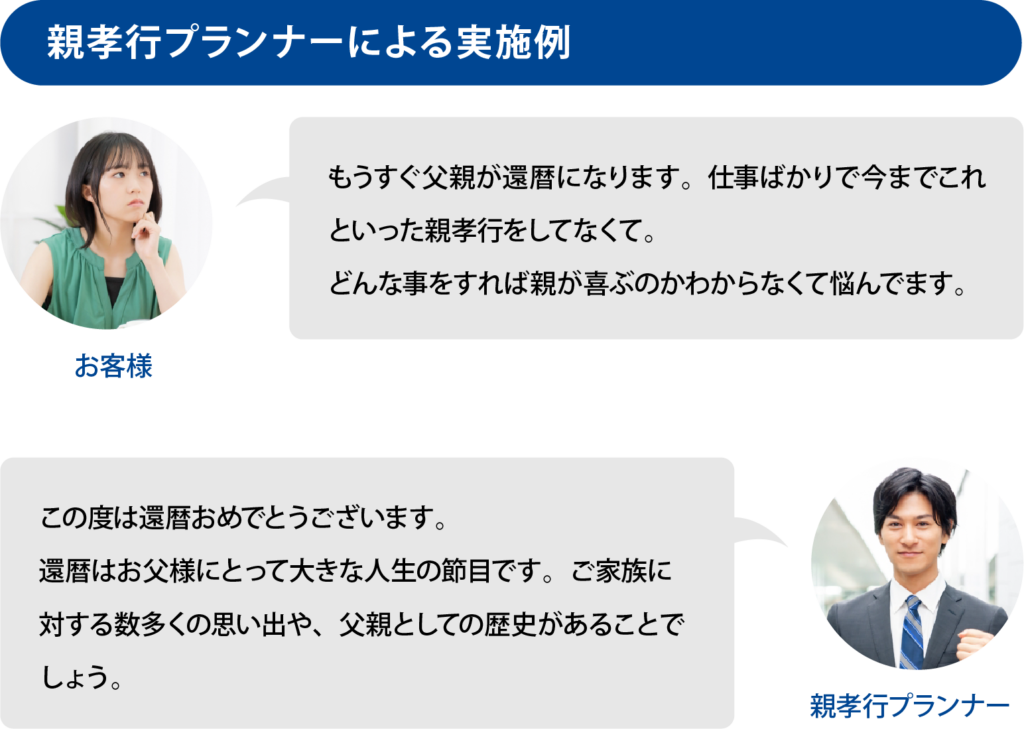一人一人に合った“親孝行”をプランニングし、実行のサポートを行います。 一つの家族に一人の親孝行プランナーが専属で担当し、家族がこれから迎えるライフイベントのサポート役となります。